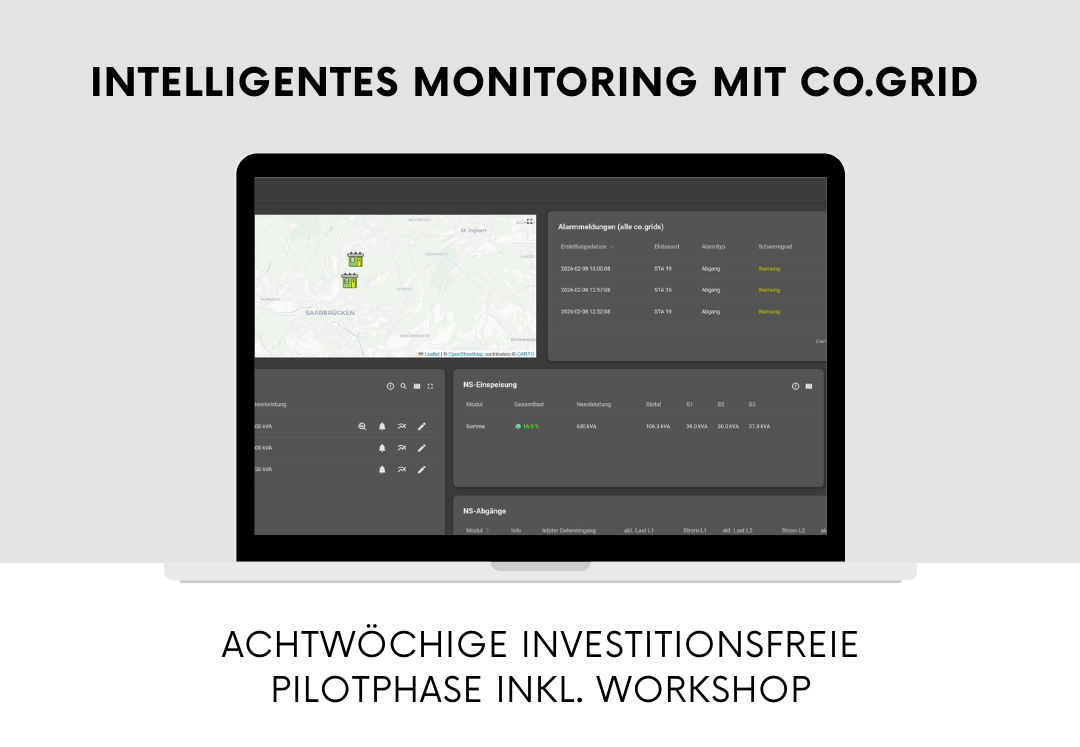 Unser Lösungspaket co.grid® für das digitale Niederspannungsnetz gemäß §14a EnWG bietet ein betriebsbereites Monitoring-System, das die Netzkenngrößen aus Ortsnetzstationen und Kabelverteilerschränken effizient erfasst und visualisiert.